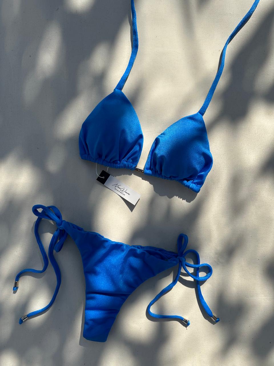 Combine o Biquíni Azul Ocean Glow como uma saída de praia chemise branca e rasteirinhas para um look despojado e fashion na beira do mar.