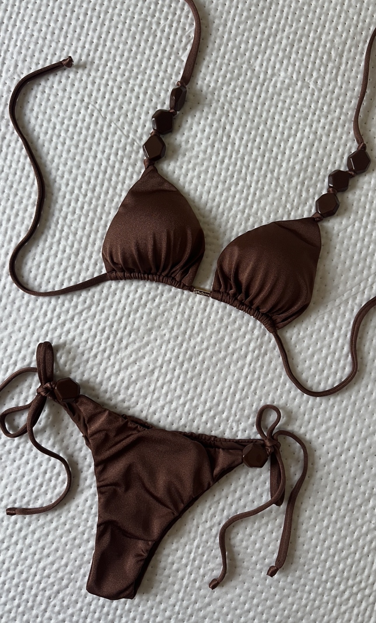 Combine o nosso biquíni marrom com uma pareô curta marrom para um look monocromático e moderno.