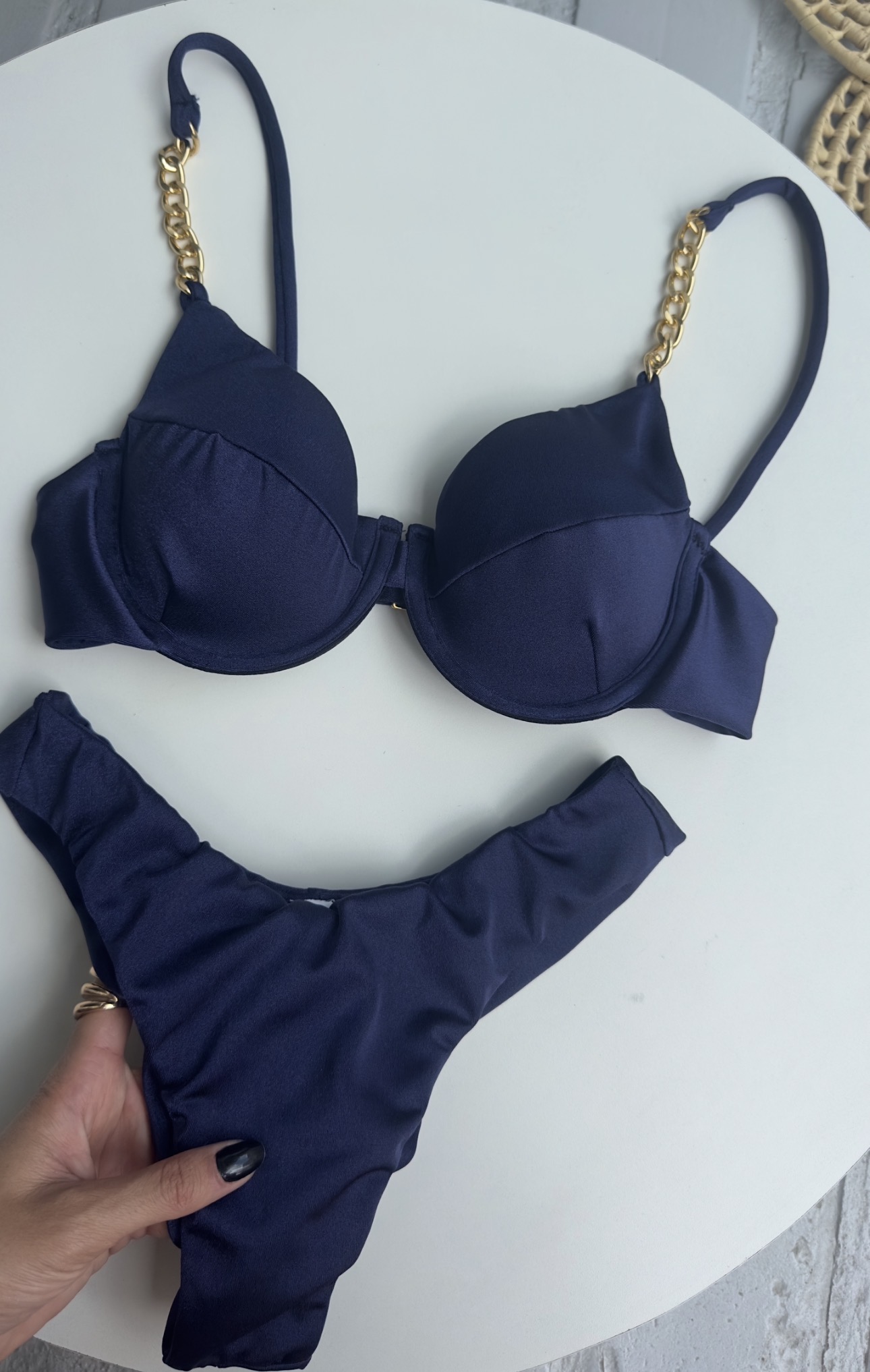 Nosso top meia taça contém aro para sustentar e modelar o busto, nas alças detalhes em correntes dourada traz imponência e sofisticação ao look resort wear.