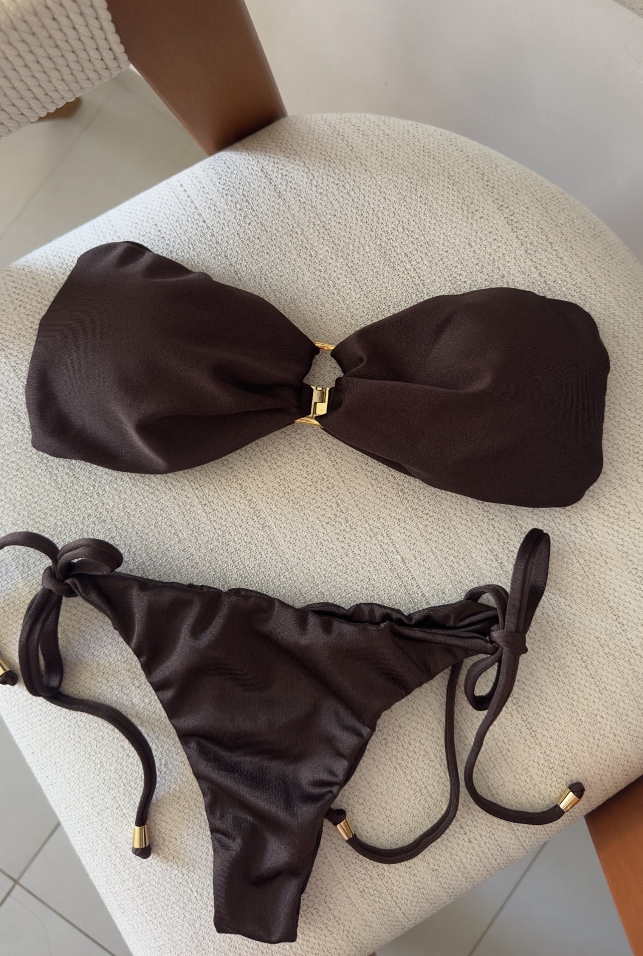 Styling new wave biquíni tomara que caia com a pareô marrom para um look monocromático moderno.